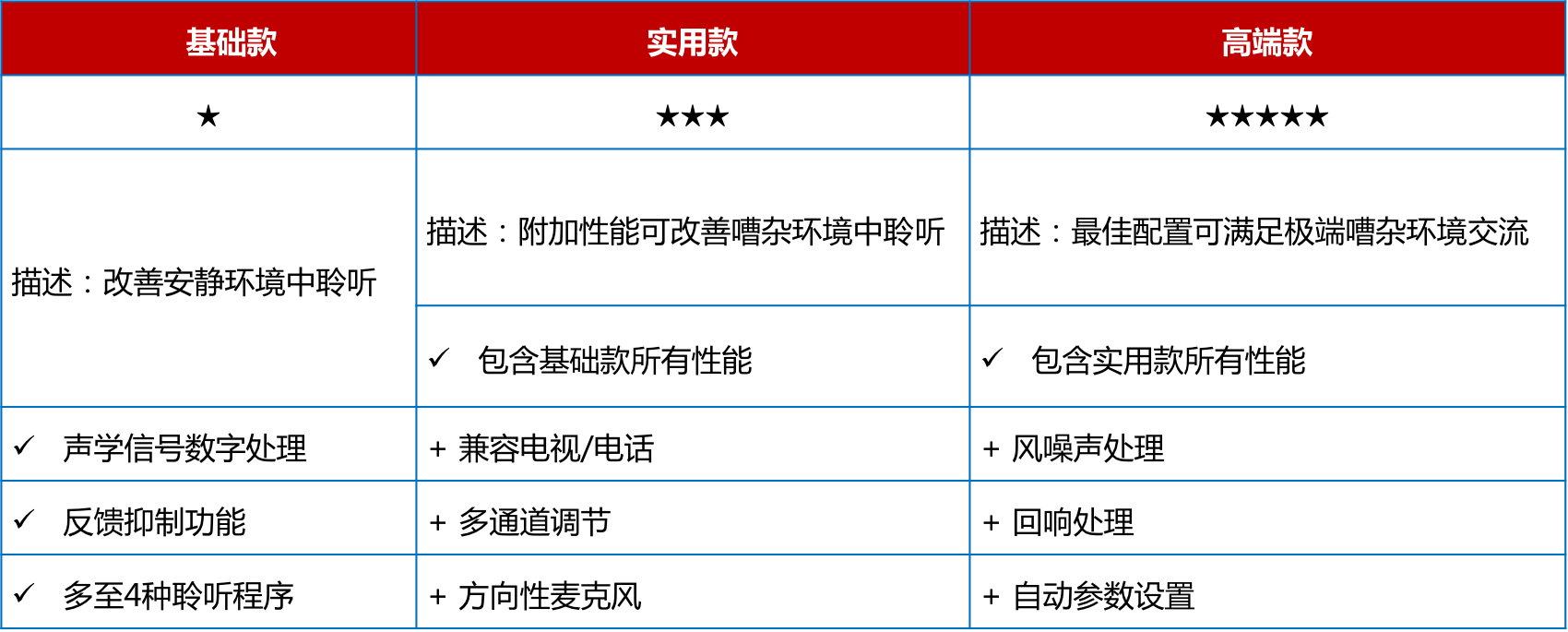 <span style="font-size:16px;"> 助聽器價格取決于機器的檔次,而檔次由內(nèi)含的技術(shù)種類決定。助聽器檔次大致可分為基礎(chǔ)款、實用款、高端款。這三種檔次的區(qū)別請參見下表:</span></p><p style="text-align: center;"><span style="font-size:16px;"><img src="/upfiles/201808150226553383.png" width="640" alt="" /><br /></span></p><p><span style="font-size:16px;"> 那么,如何應(yīng)該選擇哪種檔次的助聽器呢?</span></p><p><span style="font-size:16px;"> 選擇助聽器時主要需要考慮兩大因素。首先要考慮的就是弱聽人士的聽力損失程度,其次要考慮的就是弱聽人士的日常生活方式。比方說,某位弱聽人士是中度聽力損失,日常在家為主,那么實用款檔次助聽器通??梢詽M足TA的需求。</span></p><p><span style="font-size:16px;"> 當然,這里只是為助聽器選配提供了大致方向,如何選配仍然需要具體情況具體分析,最好還是需要跟驗配師面對面溝通。</span></p><p><span style="font-size:16px;"> 1、高端款助聽器</span></p><p><span style="font-size:16px;"> 不同廠家的高端款助聽器均代表了各自的尖端技術(shù),并致力于提供最佳的音質(zhì)。</span></p><p><span style="font-size:16px;"> 這類助聽器高端之處在于自動適應(yīng)各種聆聽環(huán)境,最優(yōu)化佩戴者的聆聽清晰度和舒適度,讓佩戴者在極度嘈雜的環(huán)境中,如咖啡館,也能清晰地聽到同伴的言語聲。常見性能包括:</span></p><p><span style="font-size:16px;"> (1) 多種外觀、顏色可選;</span></p><p><span style="font-size:16px;"> (2) 環(huán)境自適應(yīng);</span></p><p><span style="font-size:16px;"> (3) 360°信號追蹤;</span></p><p><span style="font-size:16px;"> (4) 兼容各種藍牙設(shè)備。</span></p><p><span style="font-size:16px;"> 高端款助聽器為什么能夠自動適應(yīng)各種聆聽環(huán)境呢?這是因為左右兩側(cè)的高端款助聽器能夠相互“通電報”,精準判斷所處的聆聽環(huán)境并自主學(xué)習(xí),給出最佳的助聽設(shè)置。</span></p><p><span style="font-size:16px;"> 比如,您經(jīng)常出入一家書店,每次您進入這家書店時總是習(xí)慣性地將音量調(diào)低2分貝;長此以往,當您再次進入該書店時,兩臺助聽器將會默契地降低2分貝。</span></p><p><span style="font-size:16px;"> 360°信號追蹤可以幫助佩戴者建立更佳的空間感知,對所處環(huán)境有充足的把控和預(yù)判,避免一些潛在的危險。而當助聽器連接至各種藍牙設(shè)備時,聆聽清晰度會更高,且不會打擾其他人。</span></p><p><span style="font-size:16px;"> 比如家人總是抱怨您把電視機聲音開得太大,拒絕跟您一起觀看電視時,您可以選配能夠兼容電視的助聽器,并進行獨立的音量調(diào)節(jié),而家人只需設(shè)置為常規(guī)音量即可。高端款助聽器的價位一般在15000以上。</span></p><p style="text-align: center;"><span style="font-size:16px;"><img src="/upfiles/201808150228328500.jpg" alt="" /><br /></span></p><p><span style="font-size:16px;"> 2、實用款助聽器</span></p><p><span style="font-size:16px;"> 實用款助聽器的價格一般在8000~15000之間。實用款助聽器包含一定的降噪技術(shù)和言語提升功能,可以滿足大多數(shù)環(huán)境中的聆聽需求。部分廠家的實用款助聽器也可兼容各種藍牙設(shè)備。實用款助聽器的突出性能大致包括:</span></p><p><span style="font-size:16px;"> (1) 可連接外接音源;</span></p><p><span style="font-size:16px;"> (2) 言語清晰度提升;</span></p><p><span style="font-size:16px;"> (3) 方向性功能。</span></p><p><span style="font-size:16px;"> 3、基礎(chǔ)款助聽器</span></p><p><span style="font-size:16px;"> 基礎(chǔ)款助聽器的價位一般在8000以下。基礎(chǔ)款助聽器能夠滿足安靜環(huán)境中的交流需求,并具備反饋管理功能。反饋管理功能能夠有效提升佩戴舒適度,避免在日常佩戴過程中出現(xiàn)尖銳的干擾聲。</span></p><p><span style="font-size:16px;"> 基礎(chǔ)款助聽器適用于經(jīng)常在家的弱聽人士,若是生活方式比較豐富多彩的弱聽人士建議選配其他檔次的助聽器。實用款助聽器的突出性能大致包括:</span></p><p><span style="font-size:16px;"> (1) 數(shù)字信號處理技術(shù);</span></p><p><span style="font-size:16px;"> (2) 反饋管理功能;</span></p><p><span style="font-size:16px;"> (3) 多種聆聽程序可選。</span></p><p><span style="font-size:16px;"> 更多詳情請登錄m.fangdaochuangsha.com。</span></p>" />