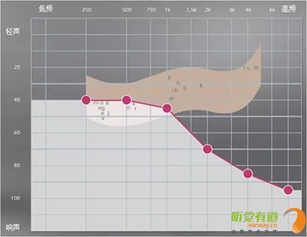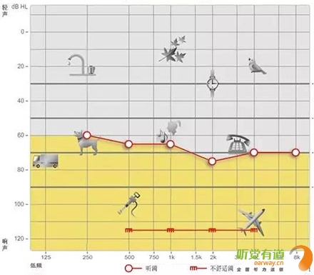 <span style="font-size:16px;"> 純音測試聽力圖的橫坐標為頻率,從左至右表示測試聲的頻率從低到高,即125Hz至8000Hz;縱坐標為強度,從上至下表示受試者能聽到的最小的聲音強度,以dBHL為單位。如下圖所示:</span></p><center><span style="font-size:16px;"><img alt="" src="/upfiles/201810080127399978.png" width="440" height="400" /></span></center><p></p><p><span style="font-size:16px;"> 聽力圖的畫法自從1943年在C.C.Bunch的著作中出現后,至今沒有改變。通常右耳的測試結果用紅色表示,左耳用藍色。下圖是ASHA(1990)建議使用的各種標記符號,這些符號已在世界各地廣泛使用。</span></p><center><span style="font-size:16px;"><img alt="" src="/upfiles/201810080127444763.png" width="440" height="250" /></span></center><p></p><p><span style="font-size:16px;"> 純音測試的測試項目有氣導、骨導、舒適閾與不舒適閾。那么這簡簡單單的聽力圖在驗配過程中有哪些重要作用呢?</span></p><p><span style="font-size:16px;"> 1、確定聽力損失程度</span></p><p><span style="font-size:16px;"> 按照世界衛生組織(WHO)1997年的標準,根據0.5kHz、1kHz、2kHz、和4kHz氣導平均聽閾值,將聽力損失分為輕度、中度、重度和極重度。</span></p><center><span style="font-size:16px;"><img alt="" src="/upfiles/20181008012749435.png" width="440" height="180" /></span></center><p></p><p style="text-align: center;"><span style="font-size:16px;color:#999999;">世界衛生組織(WHO-1997)的聽力障礙分級標準</span></p><p style="text-align: left;"><span style="font-size:16px;"> 下圖為某一聽力損失者所測得的聽力圖</span></p><center><span style="font-size:16px;"><img alt="" src="/upfiles/201810080127552977.png" width="440" height="380" /></span></center><p></p><p><span style="font-size:16px;"> 0.5kHz的聽閾為65dBHL,1kHz的聽閾為65dBHL,2kHz的聽閾為75dBHL,4kHz的聽閾為70dBHL。則平均聽閾為(65+65+75+70)/4=68.75。將68.75dBHL代入以上分級表格,得到該聽力損失者的損失程度為重度。 聽力損失程度的確定有利于確定助聽器的功率。</span></p><p><span style="font-size:16px;"> 2、判斷聽力損失性質</span></p><p><span style="font-size:16px;"> 根據氣導、骨導的關系,可將聽力損失分為傳導性聽力損失、感音神經性聽力損失及混合性聽力損失。</span></p><p><span style="font-size:16px;"> 骨導與氣導之差大于10dB,且骨導在正常范圍內為傳導性聽力損失,表明聽力下降是由外耳、中耳病變引起。</span></p><p><span style="font-size:16px;"> 氣骨導一致(≤10dB)且都在正常范圍之外為感音神經性聽力損失。表明聽力下降是由耳蝸、聽神經損傷引起。</span></p><p><span style="font-size:16px;"> 骨導與氣導之差大于10dB,但骨導在正常范圍之外為混合性聽力損失,表明以上兩種聽力損失均有,由上述多種部位病變引起聽力下降。確定聽力損失性質還需結合臨床表現,也有助于助聽器佩戴效果的預測。</span></p><p><span style="font-size:16px;"> 3、解釋聽力損失者的日常生活困難</span></p><p><span style="font-size:16px;"> 聽力損失者在日常生活中經常遇到的問題有1)時而聽得到,時而聽不到;2)聽得到,聽不清;3)小聲聽不到,大聲受不了。</span></p><p><span style="font-size:16px;"> 時而聽得到時而聽不到</span></p><p><span style="font-size:16px;"> 以下圖平坦型聽力曲線為例,當周圍言語聲高于其聽閾,即處于曲線下方區域時,該聽力損失者能聽到;當周圍言語聲低于其聽閾,即處于曲線上方區域時,聽力損失者則聽不到對方的說話聲。此為“時而聽得到,時而聽不到”。</span></p><center><span style="font-size:16px;"><img alt="" src="/upfiles/201810080128042378.png" width="440" height="340" /></span></center><p></p><p><span style="font-size:16px;"> 聽得到 聽不清</span></p><p><span style="font-size:16px;"> 中文漢語元音輔音的頻率及響度有其分布圖,如下圖所示。以陡降型聽力曲線為例,該聽力損失者聽不到大部分的輔音。聽得清不清楚,主要取決于高頻輔音聽得到聽不到。例如該聽力損失者“g”、“ch”聽不到,但“u”能聽到,因此,他會將“姑姑”、“出租”都聽成“uu”。聽不清楚時,再結合口型,前后句的冗余度猜測。猜對則談話繼續,猜錯則打岔。兒童聽力曲線若是如此,長期接收不正確的語音,會出現口齒不清。</span></p><center><span style="font-size:16px;"><img alt="" src="/upfiles/201810080128148209.png" width="440" height="340" /></span></center><p></p><p><span style="font-size:16px;"> 小聲聽不到 大聲受不了</span></p><p><span style="font-size:16px;"> 小聲聽不到,大聲受不了是重振現象。以下圖聽力曲線為例,“飛機”處于不舒適閾附近,聽力損失者對“飛機”的聲音聽著受不了。另外,該聽力損失者聽不到“手表”等聲音。</span></p><center><span style="font-size:16px;"><img alt="" src="/upfiles/201810080128202005.png" width="440" height="385" /></span></center><p></p><p><span style="font-size:16px;"> 為了更好地使聽力損失者家屬明白聽力損失者的困難,目前有較多的工具可以模擬聽力損失狀態下的溝通與交流。</span></p><center><span style="font-size:16px;"><img alt="" src="/upfiles/201810080128265518.png" width="440" height="370" /></span></center><p></p><p><span style="font-size:16px;"> 比如,在聲音樣本中選擇“餐廳”,并選擇“正常”,可聽到正常聽力者在“餐廳”環境中聽到的聲音;若選擇“患者”,則可使聽力正常者聽到聽力損失者聽到的聲音,令聽力正常者親身體驗他們所處的“模糊世界”。</span></p><p><span style="font-size:16px;"> 在“典型聽力圖”中,有“輕度”、“中度”、“重度”、“極