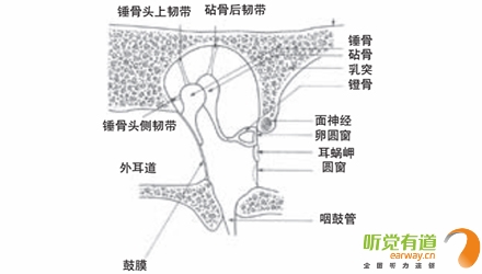 <span style="font-size:16px;"> 中耳結構包括鼓室、咽鼓管、鼓竇和乳突腔四部分。鼓室內有聽骨、肌肉、韌帶和神經。中耳是換能器,換能是將一種能量形式轉換成另一種能量形式,中耳通過鼓膜和聽骨鏈將聲能轉換為機械能,再由鐙骨底板將機械能轉換為內耳的液態能。</span></p><p><span style="font-size:16px;"> 鼓膜是中耳和外耳的分界,呈橢圓形,中間稍向內凹陷,色灰白,較透明,與耳道底約呈30°角。鼓膜寬約8mm,高約9mm,厚0.1mm,質地韌,其構造分三層:外層是皮膚層,中層由淺層的放射狀和深層的環狀纖維組成,它們使得鼓膜能承受一定的氣壓和水壓并抗感染,內層為粘膜層,與鼓室粘膜相連續。聲音的振動,即聲能,通過耳郭和耳道共振的加強,引起鼓膜隨之振動,鼓膜與中耳的錘骨相連,在正常耳,錘骨懸掛在自鼓膜頂端至下2/3處。錘骨柄的尖端將鼓膜頂向中耳,形成錐形鼓膜的頂,稱作臍。自臍向前下達鼓膜邊緣有一個三角形的反光區,名光錐,是外來光線被鼓膜的凹面集中反射而成。鼓膜下4/5為緊張部,上1/5由于缺乏纖維層而較松馳,稱為松弛部。鼓膜可分為前上、前下、后上、后下四個象限。兒童的鼓膜薄而有彈性,年齡越大,鼓膜越厚且越僵硬。鼓環將鼓膜固定在某一位置,使其成為在外耳和中耳之間的一層防水防氣的屏障。</span></p><center><span style="font-size:16px;"><img alt="" src="/upfiles/201810080137189845.png" width="440" height="250" /></span></center><p></p><p><span style="font-size:16px;"> 中耳鼓室</span></p><center><span style="font-size:16px;"><img alt="" src="/upfiles/201810080137242362.png" width="440" height="250" /></span></center><p></p><p><span style="font-size:16px;"> 正常鼓膜像(左)</span></p><p><span style="font-size:16px;"> 在中耳腔內的聽骨是人體最小的骨頭,分別叫作錘骨、砧骨和鐙骨。這些聽骨由韌帶連接并懸掛起來形成了聽骨鏈。錘骨柄附在鼓膜上,錘骨頭與砧骨頭形成錘砧關節,砧骨底與鐙骨頭形成砧鐙關節,鐙骨底板由環狀韌帶固定在卵圓窗上。聽骨鏈利用杠桿原理使來自鼓膜的機械能放大,傳遞到卵圓窗。</span></p><center><span style="font-size:16px;"><img alt="" src="/upfiles/201810080137303051.png" width="440" height="250" /></span></center><p></p><p><span style="font-size:16px;"> 聽骨鏈</span></p><p><span style="font-size:16px;"> 咽鼓管是中耳通氣引流的唯一途徑,也是中耳感染的主要途徑。它的一端開口在較高的中耳鼓室腔,另一端開口在較低的鼻咽部,通過咽鼓管在鼻咽部的開口,空氣可從外界直接進入中耳腔。咽鼓管平時處于關閉狀態,能較好的防止細菌感染,只有在咳嗽、擤鼻涕、打哈欠或吞咽時,咽鼓管才開放。當咽鼓管開放時,根據鼓膜外側的壓力情況,空氣或者從中耳流向外界,或者從外界流向中耳,使中耳壓力得以平衡。</span></p><p><span style="font-size:16px;"> 更多詳情請登錄m.fangdaochuangsha.com</span></p>" />