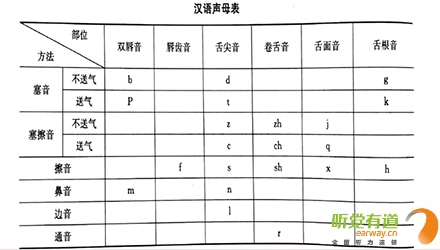 漢語聲母表中塞音(即爆破音)、塞擦音、擦音等包含的字母可參考如下表格: